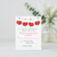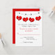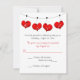 This fun and cute black and white wedding reply card has four red hearts strung across the top of the invitation like bunting, with the letters RSVP on them. It matches the wedding invitation shown below.