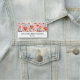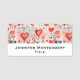 Name tag with a fun mixed media style pattern. Big red hearts and various random shapes scattered around making a delightfully cute pattern.