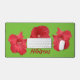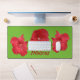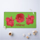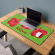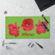 Three bold red Hibiscus blossoms on a sbright green tropical desk mat personalised with a Name.