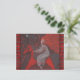 Postcard featuring "Red Horse" painting. Beautiful woman with long ginger hair riding on the scarlet red horse through the night forest. Stylised trees and flowers surrounding them, full moon watching from the sky. Red, grey, orange and brown colours. Fantasy art, pastel painting, drawn by imagination. Soft pastels on paper, 2016