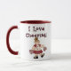 A blonde haired cheerleader in a red skirt with red pom poms and red text that reads "I Love Cheering!" is featured on cheerleader T-shirts, mugs, tote bags, buttons, cards, stickers, and other cheering items!