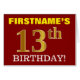 This birthday greeting card design features a message like "FIRSTNAME’S 13th BIRTHDAY!", with the "13th" having a faux/imitation gold-like colour appearance. The recipient’s name on the front can be personalised, and the front background is coloured red. It also features a customisable birthday greeting message on the inside. A birthday greeting card like this could perhaps be given to somebody in celebration of their thirteenth birthday. [~Z0000184]