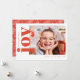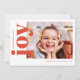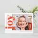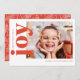 This is a bright and simple modern red and white holiday card featuring a minimalist single photo combined with “joy” in a bold and classic serif font.