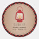 A sticker featuring an illustration of a red camping lantern over a card stock inspired background with a red and black plaid border. Look for matching invitations at Jill's Paperie.