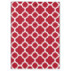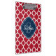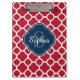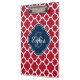 Navy blue and white quatrefoil label frame featuring a customisable name and monogram template. The background is a red and white Moroccan trellis lattice pattern.
