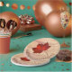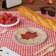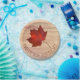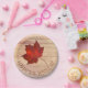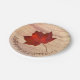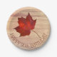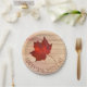 Red leaf custom fall party paper plates. Rustic light wood background with big red maple leaf in the centre. Customise the curved, printed text along the bottom to celebrate your event.