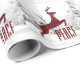 Winter woodland Christmas gift wrap with a red metallic looking leaping reindeer and the word PEACE set against a black and white faded snowy forest with snow covered pines and fir trees.