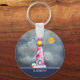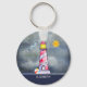 A keychain with a whimsical red-striped lighthouse and a colourful beach ball resting against its wall. A grey seagull flies off in the distance. A yellow sun smiles happily in the sky. Billowing stormy clouds closing in from behind. All done in watercolors.