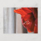 Send a friend a striking postcard featuring a close-up view of a beautiful Red Lion amaryllis flower backlit by the sun. The sunlit red petals of the blossom are in front of out-of-focus beige curtains. Six stamens emerge from the dark centre of the bloom with red filaments curving up to fuzzy-looking beige anthers. The pistil curves up beside them.