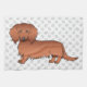 Destei's original cartoon illustration of an adorable long hair red coat colour Dachshund breed dog. The background has a pattern of grey dog paw prints.