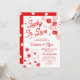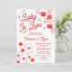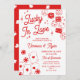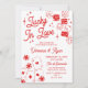 Lucky in Love engagement party invitation with hand-drawn illustrations of dice with heart-eyes, poker chips, and an ace of each suite, all in a red and white design.