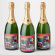 Red Merry Christmas sparkling wine bottle labels with changeable photos and text - you can add your family name and change photos, printed on red background