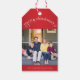 Red Merry Christmas photo gift tags with changeable photo and text - you can add your photo, family name and year.