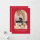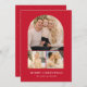 Modern holiday photo card featuring 3 of your photos arranged in an arch-shaped grid layout. Personalise the front of the multi-photo holiday card with your custom greeting and family name displayed in white lettering with a red background. The card reverses to a subtle red and white dot pattern.