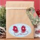 A cute pair of red mittens on a red string. A soft blue background with little white snowflakes dancing about.