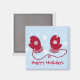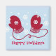 A cute pair of red mittens with a red string and little snowflakes. A soft blue background with white snowflakes in various sizes and shapes. Says 'happy holidays' this can be changed if so desired.