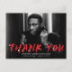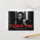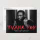 Stylish, modern graduation thank you postcard featuring the graduate's horizontal photo with "Thank You" in red lettering with white paint splatters. Personalise the front of the thank you postcard by adding the graduate's name, school name, and graduation year. The back of the graduation thank you postcard features your return address and space for a typed or handwritten thank you message.