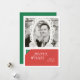 This modern Christmas holiday card features one photo and a unique type layout among blocks of coral red with small, festive accents of Kelly green. Personalise the front with your photo of choice and a two line message of holiday cheer along with the year and name text. The matching green backer has easy to edit template text for a longer form end of year letter.