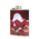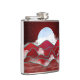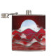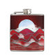 Abstract landscape design in various shades of red with a moonrise, hills, trees, clouds, and birds.