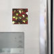 A magnet with lots of red capped mushrooms with white dots and pale stems.