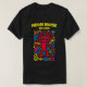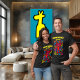 This radiant red neon alien with playful antennae and a wide pink smile beams with quirky energy. Surrounded by colourful abstract symbols on black, it’s a funky pop art design perfect for festivals, streetwear, or anyone who loves bold and cheerful statement t-shirts.
