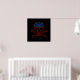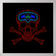 Black poster with a red and blue outline skull and crossbones.