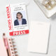 Simple vertical press ID in black with an eye-catching red color accent. News Media is written along the side, with Press beneath. Personalize this press ID template with the name of the reporter or photographer, their work title, ID photo, and the name of the publication that's sent this reporter out into the field. Add expiration date at the top. On the back of this practical journalist ID badge, personalize the QR code and add additional text.