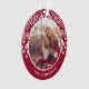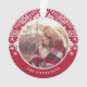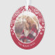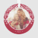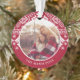 Festive Christmas photo ornament features a favourite photo on each side, encircled by a holiday sweater pattern in cranberry red and white. Personalise with your custom caption; shown with your family name and the year.