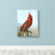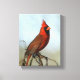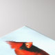 Bright red male Northern Cardinal on branch. Art has a spring blue and green background.