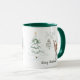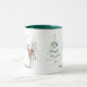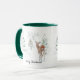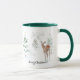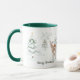 This Christmas or holiday mug features a whimsical drawing of a deer walking through a snowy pine forest. The deer is wearing a red nose and some of the trees are decorated. The Holiday message text is fully customisable so you can substitute your own greeting or add your name. Original artwork. Copyright Leah Wiedemer.