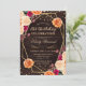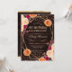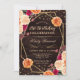 Elegant Boho Watercolor Red and Orange fall autumnal flowers and foliage design with gold geometric frame, gold glitter confetti and rustic wood background