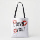 This durable tote is features my 'Red Paint Splatter Hearts, I Love You' design. The front and back have three red, paint splattered hearts with the words 'I love you!' in a black complimenting type font.