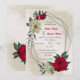 Unique wedding invitation featuring romantic red and pale yellow flowers and green leaves on a beautiful geometric frame.