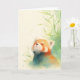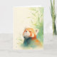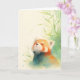 A serene red panda sits peacefully among tall green bamboo stalks, its eyes closed with a content smile. The soft watercolor-like background features delicate specks of light, giving the scene a dreamy and relaxing feel. The red panda's fur is fluffy and warm-toned, contrasting beautifully with the cool green bamboo leaves. The minimalist background creates a sense of calm and harmony, making this an ideal design for nature lovers and those who appreciate tranquil wildlife scenes.