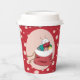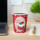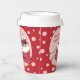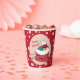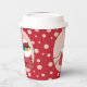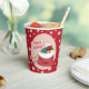 Some red Holiday paper cups with pink polka dots and a polar bear cub looking into Santa bag filled with presents . Personalise them with your text using the template . You can choose to buy lids or not .