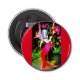 Very cute and compact little bottle opener. Also very fond of the magnet, both for sticking to the fridge and holding on to the bottle cap when trying to open it. Good quality print. As pictured.