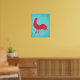 A red, quatrefoil patterned silhouette of a rooster is on a turquoise coloured background with a wood grain texture.