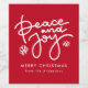 Modern holiday wine labels featuring "Peace and Joy" displayed in a hand-lettered white script with snowflakes and a red background. Personalise the Christmas gift tags with a custom greeting and your family name.