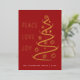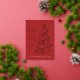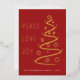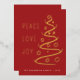 An elegant modern holiday card features an abstract line art tree with PEACE LOVE JOY in gold foil on a red card.