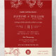 Oriental peach / plum blossoms, spring flowers in deep red, ivory and white with a simple round double happiness symbol. An elegant and romantic floral chinese themed wedding all-in-one invitation design which is whimsical, modern and classy.
