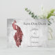 Personalise a unique wedding announcement with a Red Peacock Save the Date. Announcement design features an elegant peacock against delicate foliage and grunge background and text you can personalise with your wedding date details. Additional save the date announcement available for this design in a variety of colours.