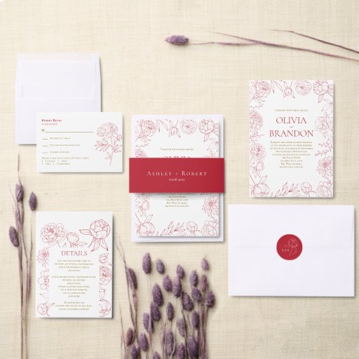 Red Peony Line Drawing Wedding Invitation, Details Wine Label