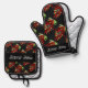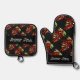 This oven mitt and pot holder set showcases a vibrant red pepper pattern. Against a black background, it is perfect for adding a Mediterranean touch to parties or kitchens. Customise them with a name today.