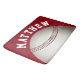 Red bath mat with a baseball print design and a white curved personalizable name printed around it. Matching bath sets and accessories available in the Charming Man Store Home/Bathroom department.