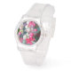 I only have one complaint. I ordered the watch with clear case and strap, and what was sent was white case and strap. I'm going to keep it because 1) it looks very nice in white, and 2) it would take too long to get a replacement made and sent in time for my occasion. Aside from the mix up with the color, the watch does look very good in white. The purple dial is actually sparkly which did not show in the online images. That was a nice surprise. If you like Swatch watches this is very similar to those. It's 33.6mm in diameter, 10.5mm thick, and 40.6mm lug to lug. Stainless steel case back says 3ATM/30m WR, so no swimming or showering or submerging this one. If you like Woodstock, this is a great choice.