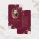 Elegant watercolor floral memory card/funeral prayer card featuring a photo adorned with pink and red roses and baby's breath flowers on a dark red background.