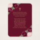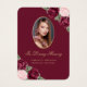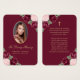 Beautiful red and pink floral memory card/funeral prayer card featuring a photo adorned with watercolor blush pink and burgundy red roses and baby's breath on a dark red background.