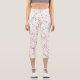 These cute capri leggings have an abstract pattern that looks like paint splatters. The splatters are in red, pink, and green on a white background.