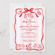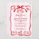 Whimsical red and pink baby shower invitation with playful doodle illustrations and vertical stripes, perfect for a baby girl-themed celebration. Featuring a vibrant hand-drawn border and bow with baby icons like a bottle, pacifier, teddy bear, and rocking horse, this cute design blends modern scribble art with classic baby elements. The pink background contrasts beautifully with the bold red linework and accents, while the loose, wavy frame adds a fun and casual feel ideal for joyful gatherings. Stylish mix of handwritten fonts gives the layout a personal and cheerful tone. This girly baby shower invite is ideal for celebrating a mum-to-be with a sweet, hand-drawn aesthetic that's fully on trend with the popular doodle design style. Available as printed cards or an instant digital download.
