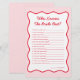 Make your event unforgettable with the Personalised Red Pink Who Knows Bride Best Bridal Shower Game! Perfect for valentines bridal shower ideas or a valentines bridal shower theme, this game adds fun to a kiss the miss goodbye party or a cherry on top bridal shower theme. Featuring a red and pink wedding theme, it’s ideal for love is in the air bridal shower ideas, drunk in love, or a drunk in love bridal shower theme. Also great for valentines wedding ideas, a Vegas Bachelorette Party, lucky in love bachelorette, or a perfect match bachelorette theme!